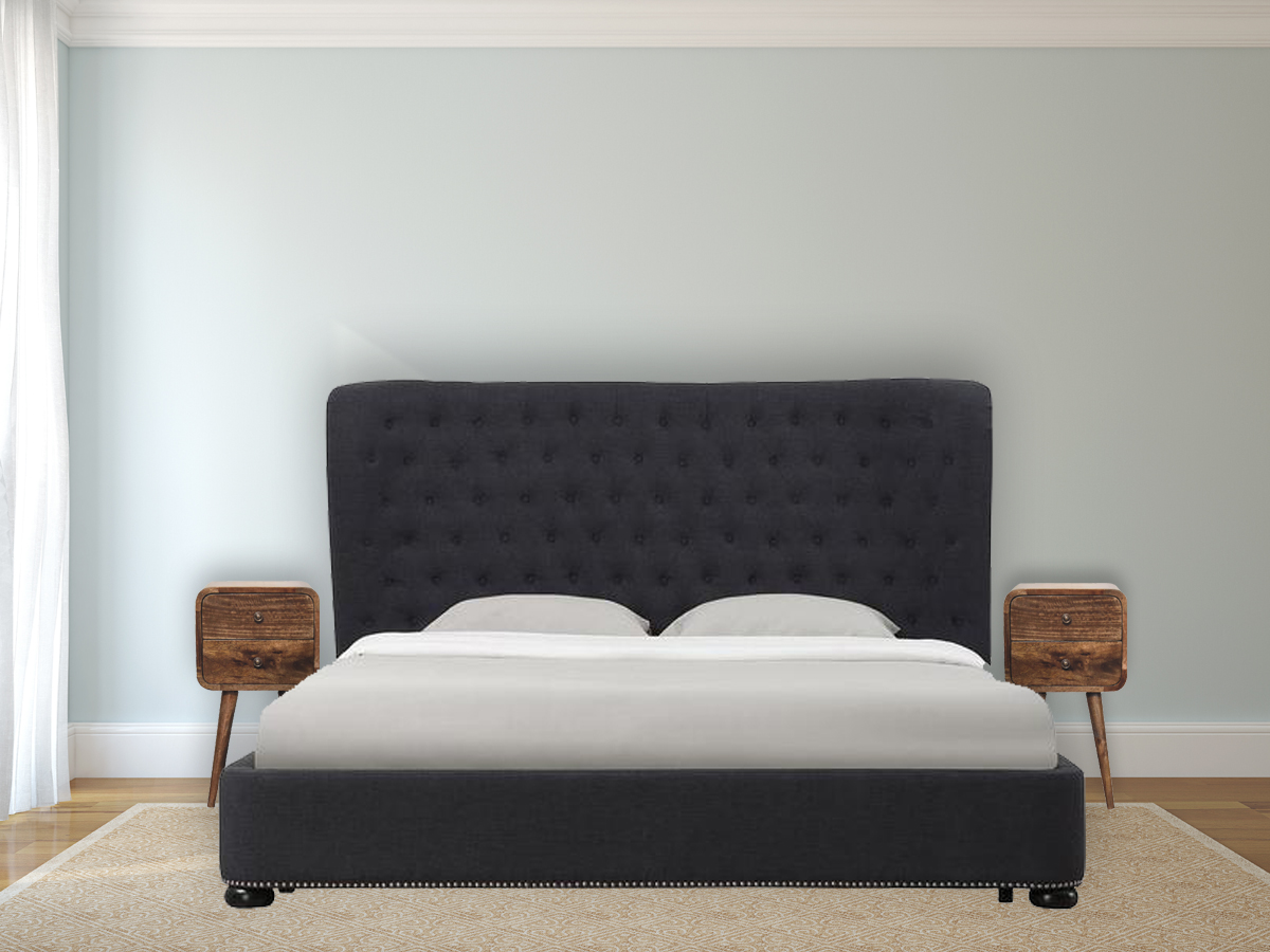 Die Mini-Version unserer berühmten geschwungenen Nachttische. Dieser kleine, aber praktische Nachttisch eignet sich perfekt für Snacks, Getränke oder eine Lampe. Er ist überall in Ihrem Zuhause praktisch und besteht aus 100 % massivem Mangoholz in einem schönen grau gekalkten Finish. Seine geschwungenen Kanten passen in jedes Zuhause. Er verfügt über zwei Schubladen mit glänzenden Knöpfen und vier nordisch anmutende Beine. Dieses kleine Produkt ist Teil der Recession Collection.